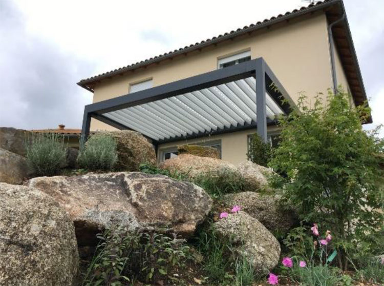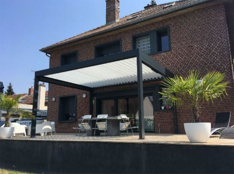 Nous proposons plusieurs modèles avec lame orientable ou rétractables. Par exemple le modèle Pergola Open’R² offre une double rétractation des lames qui se répartissent ainsi en deux paquets distincts qui se séparent au centre du toit. Ce modèle permet également d’orienter les lames jusqu’à 160°.
